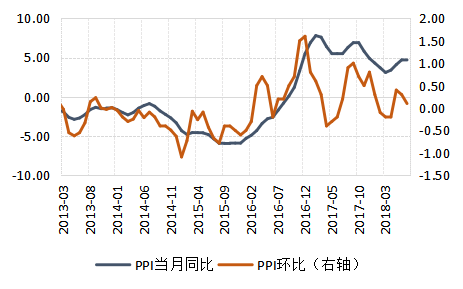 圖5 中國(guó)月度PPI數據當月同比與環比(%)